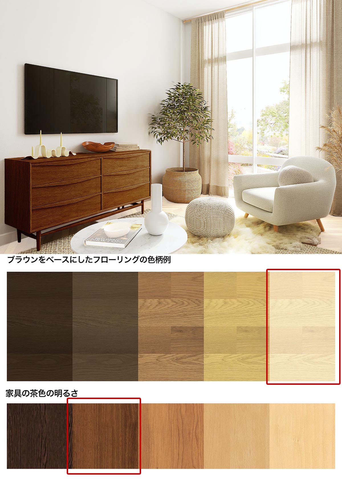 白い床と明るさ違いの茶色の家具のコーディネート5パターン&45実例インテリアFORCE。