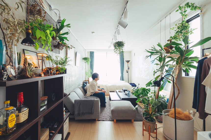 コンクリートの壁面と植物との暮らしを楽しむ。33㎡・広めワンルームの一人暮らしインテリアgoodroom journal。