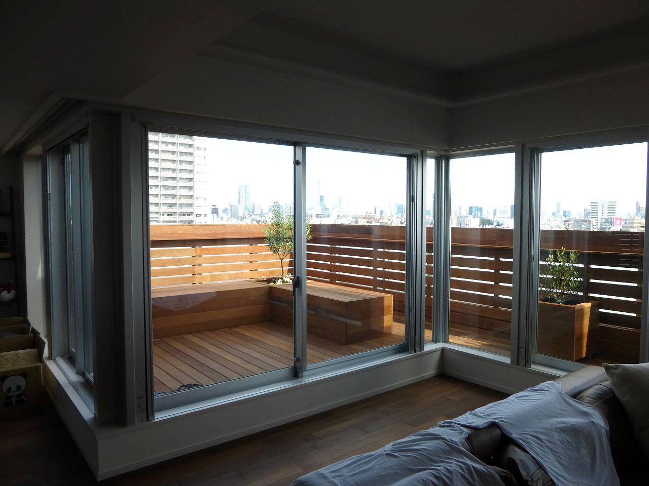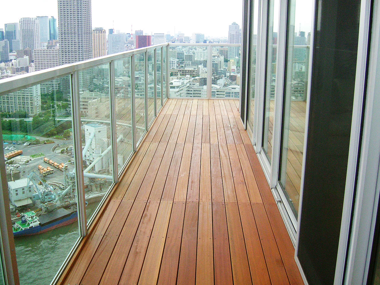 タワーマンション高層階に広がる都会のオアシス。プライベートデッキで安らぎの休日を 品川区 マンションベランダ ウッドデッキ-ガーデンハーツ株式会社横浜のウッドデッキ専門施工会社。