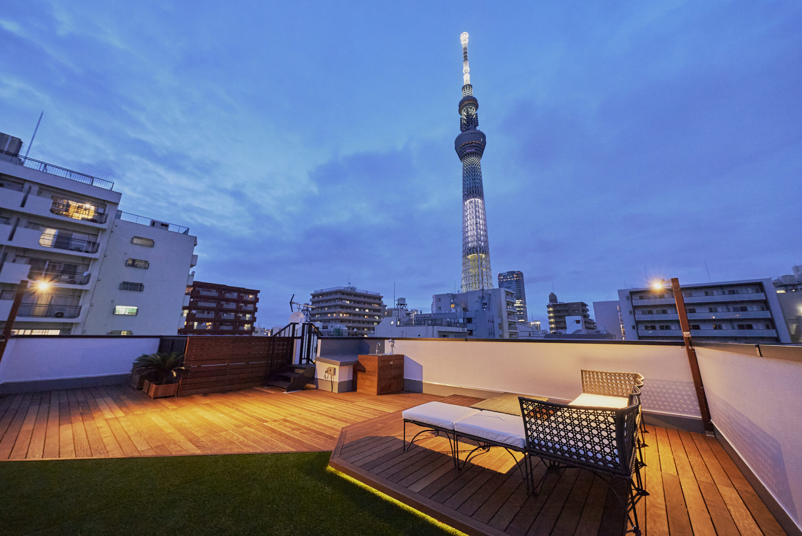 背景にスカイツリー、東京タワーの見える最上階のおしゃれスカイバルコニー 渋谷区 マンションルーフバルコニー ウッドデッキ-ガーデンハーツ株式会社横浜のウッドデッキ専門施工会社。