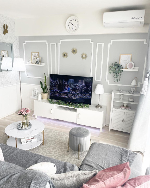 大人可愛い♡グレー×ホワイト×ピンクで作るお洒落なリビング実例。