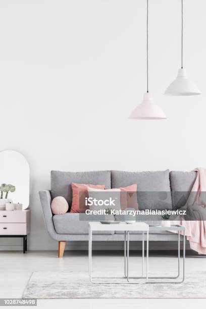 グレー、ピンク、ホワイト デスク、オフィス、ランプ、ソファ、本棚で広々 としたインテリアの写真素材・画像素材 Image 54417955。
