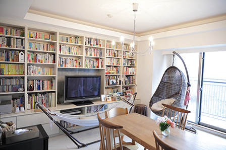 壁一面の本棚とハンギングチェアが印象的な、くつろぎ感あふれる住まい。三菱地所レジデンスの住まいのギャラリー ザ・パークハウス。