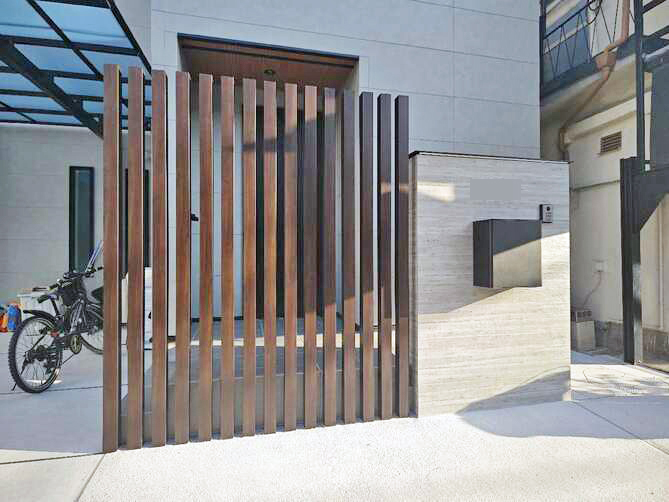 玄関に縦格子の目隠しフェンスを施した和風モダンの施工事例 日高市- 川越の外構・エクステリアは全国トップレベルの受賞歴を誇るアークふくしまへ。