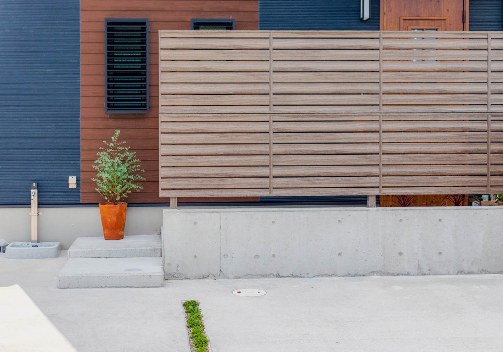 玄関前を個性的に演出する、目隠しとアクセントを兼ね備えたファサード空間。エクスプラット - エクステリア&ガーデンデザイン・プラン検索サイトRIKCADデータ無料配信。