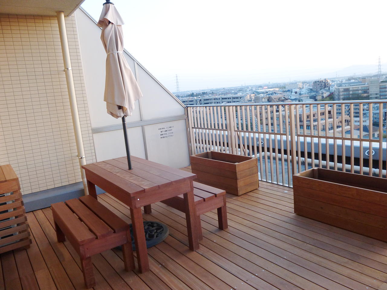 大規模修繕が終わったマンションバルコニー、ハードウッドでおしゃれなアウトドアリビングの完成 横浜市神奈川区 マンションベランダ ウッドデッキ-ガーデンハーツ株式会社横浜のウッドデッキ専門施工会社。