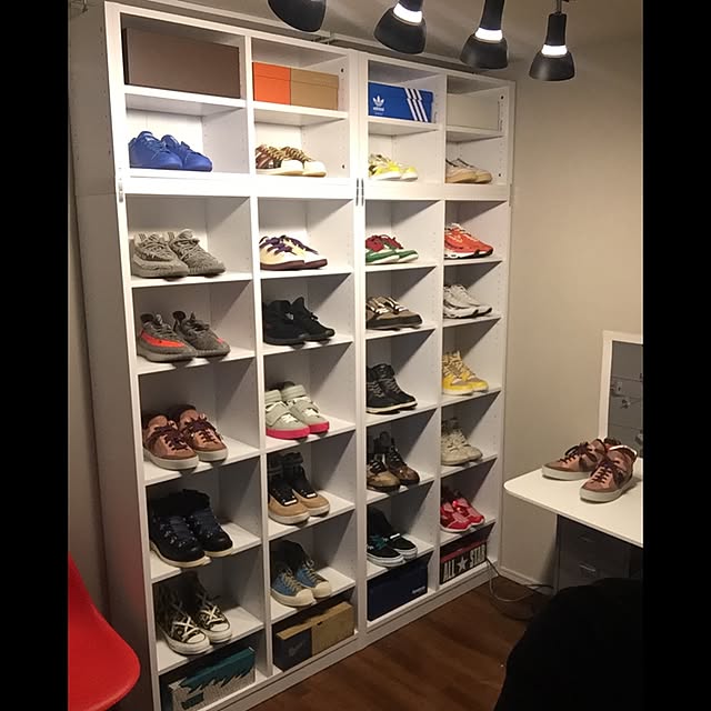 毎夜ちょこちょこ進めていき、とりあえず完成😁 服は全部クローゼットに 部屋はスニーカーのみに😏 家族からは空間の無駄使いといわれる部屋に😆w筋トレ用のベンチは踏み台にwIKEAスニーカーラックスニーカー部屋スニーカー収納スニーカーBOX。