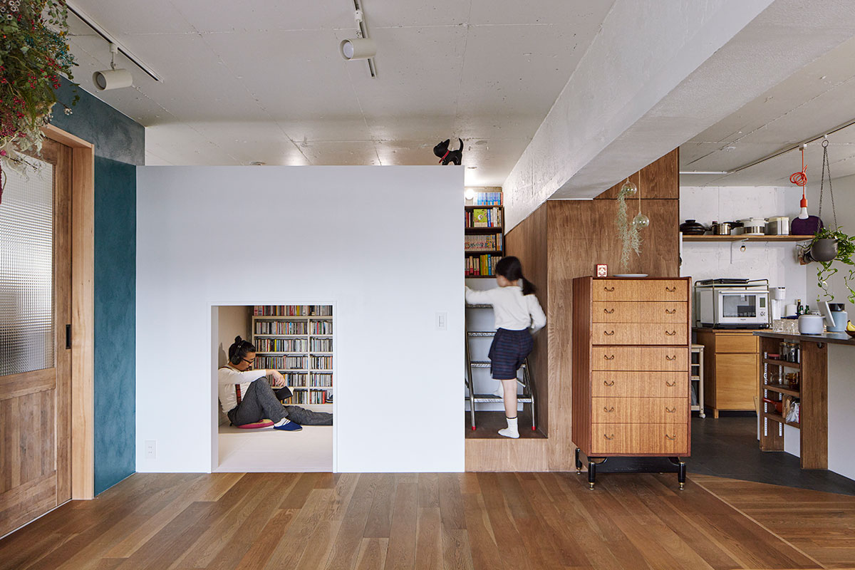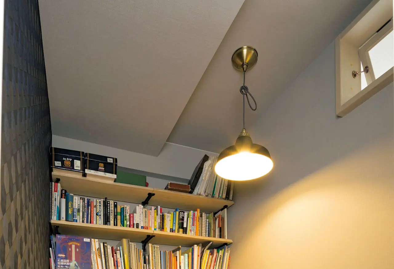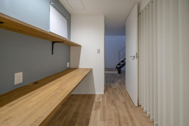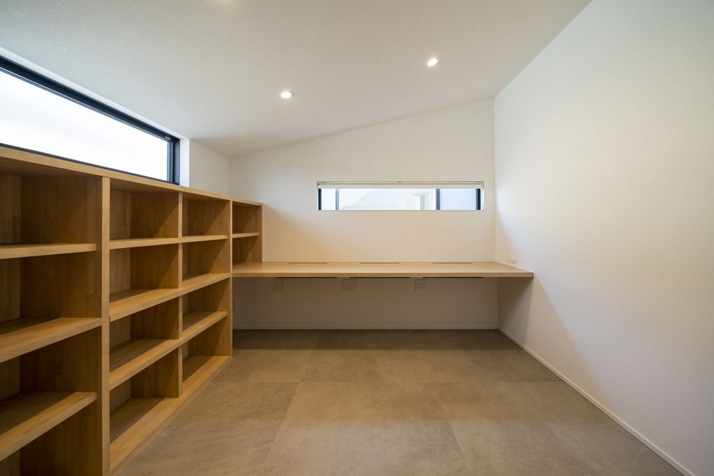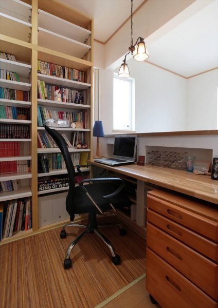 主寝室からつながる3畳の書斎。カウンターと書棚は造作。ご主人のリモートワークに最適なスペース くふうイエタテ。