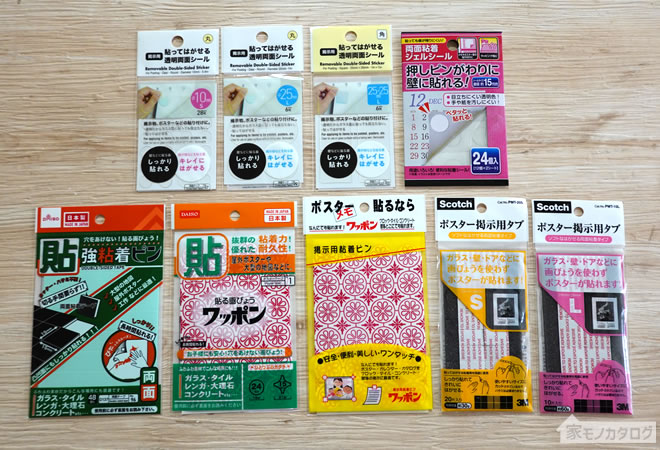 100均の穴を開けない粘着ピン・両面シール商品一覧。画鋲を使わずポスターを貼る ダイソーとセリアで100円。