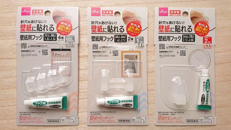 100均ダイソーの壁紙に貼れるフック 針穴をあけない! を購入。使い勝手や耐荷重をチェックします。rooms19。