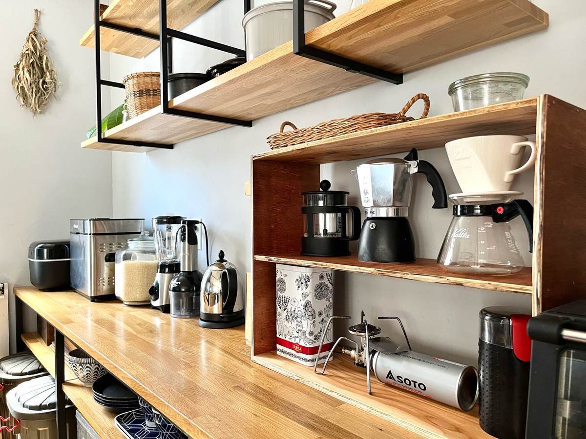 キッチン背面の棚は見せる収納に。コーヒー豆やミル、コーヒーメーカーを並べた、お気に入りのコーナー くふうイエタテ。