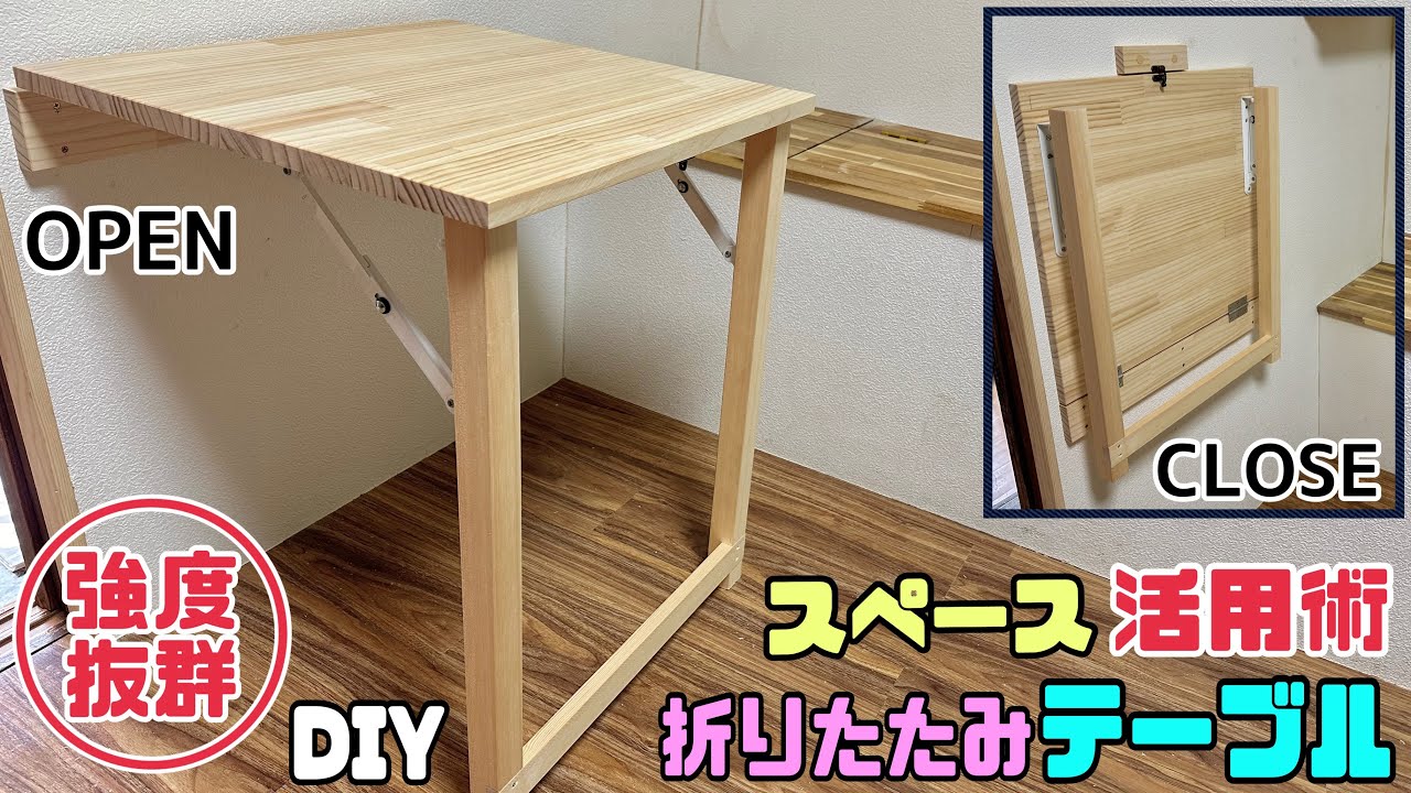 DIY収納折りたたみテーブル この金具って最高やん!!スッキリ収納できる折りたたみテーブルの作り方!!脚がたためて便利!!アウトドアやキャンプにもぴったりです!!置く場所が足りない時に!- YouTube。