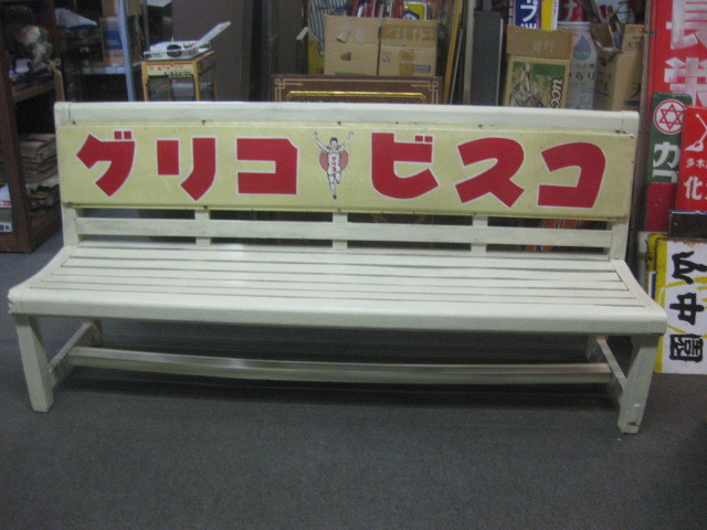 即決 昭和レトロ百貨店 グリコベンチ 片面ホーロー看板琺瑯看板 駄菓子屋商店街ディスプレイ。