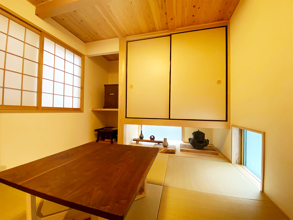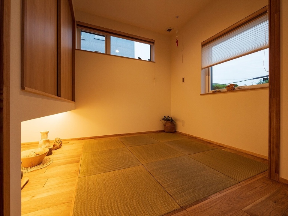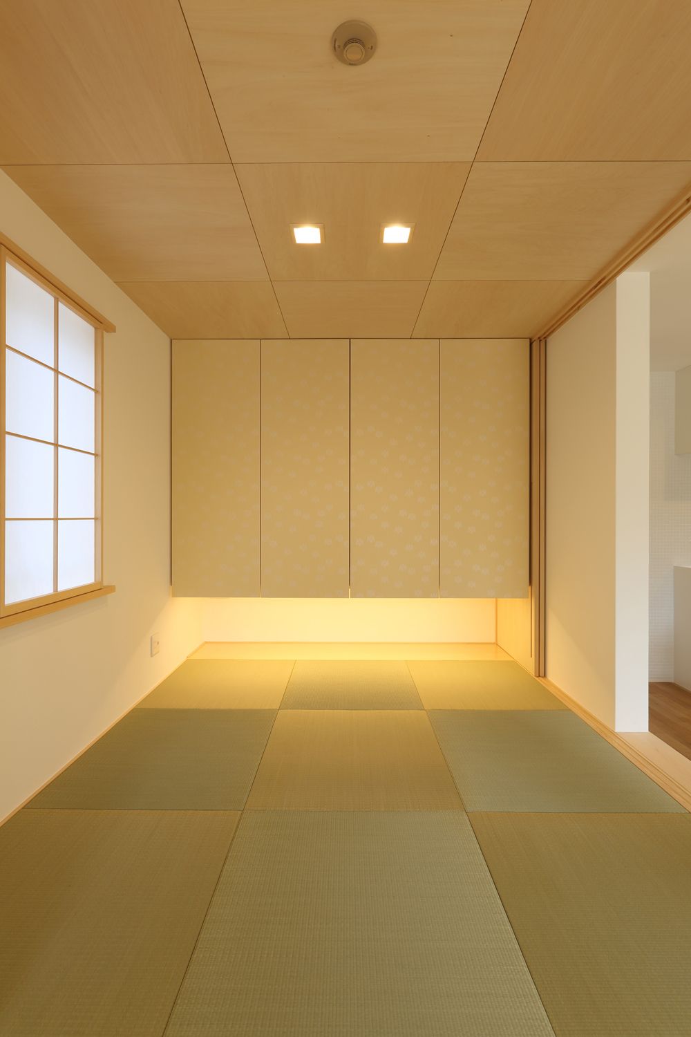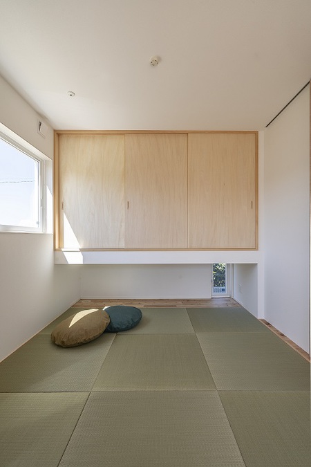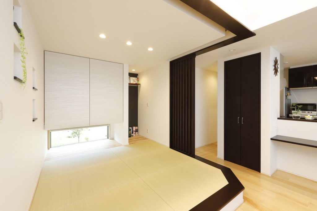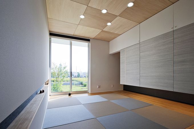 和室は吊り押入れ&地窓を採用したことで目線が抜け、4.5畳よりも広く感じられる くふうイエタテ。