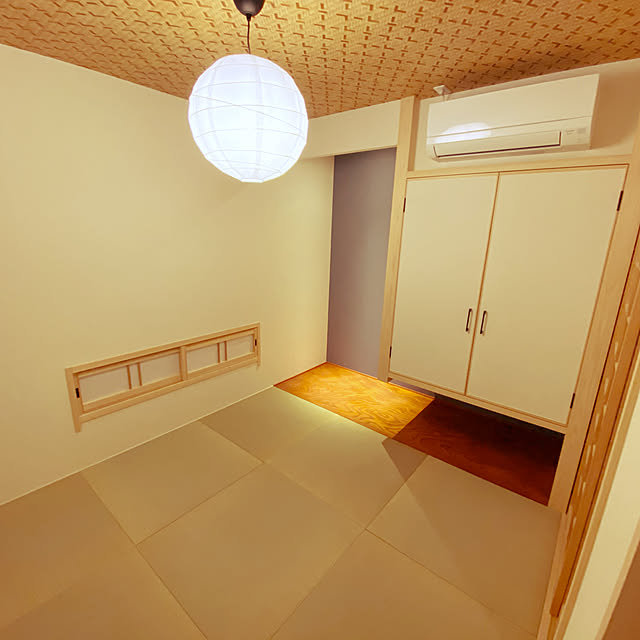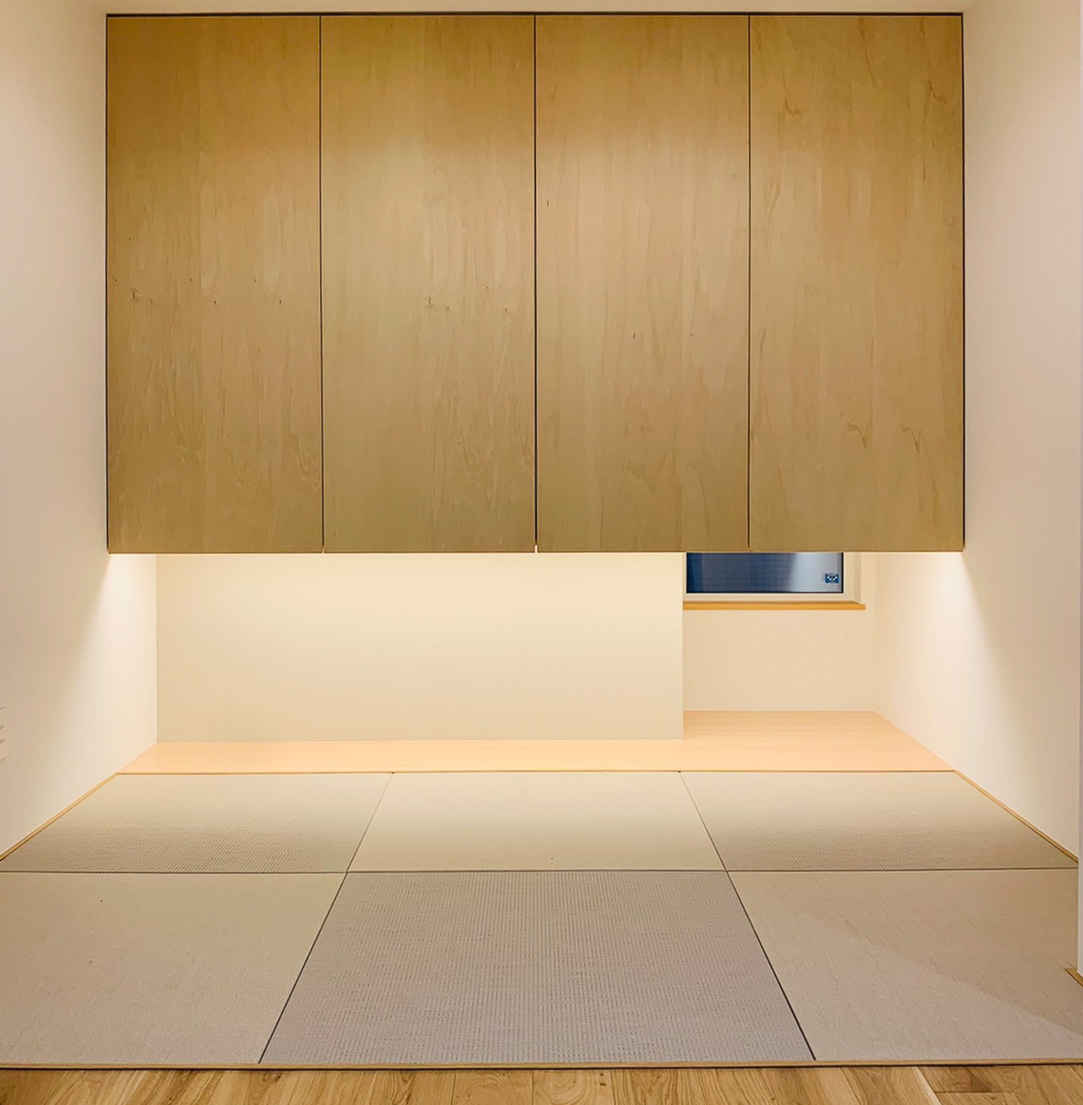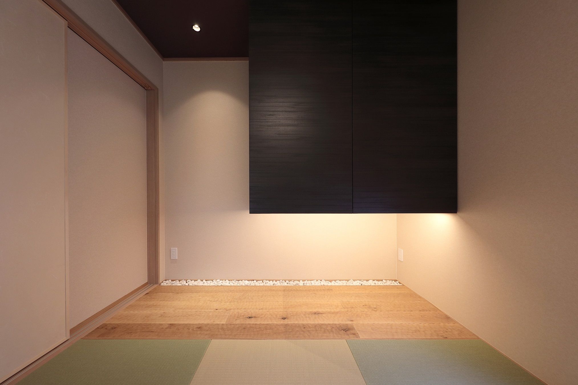 和すぎない和室。 押入れは少し浮かして、空間の広見せ。 それでも十分な大容量の収納。 扉はシナで畳との色味の統一。 家全体の雰囲気に馴染む、 和すぎない 和室。和室 吊り押入れ 小上がり畳仏間 琉球畳 間接照明高性能住宅 heat20g2zeh住宅 太陽光発電。