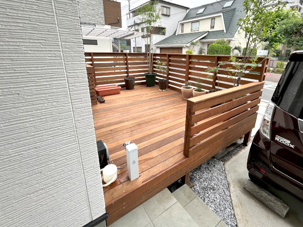 駐車場土間上デッキ。樹脂木か?ハードウッドか?どちらも選べるオーダーデッキ 一戸建て庭 ウッドデッキ 施工2例- ガーデンハーツ株式会社横浜の ウッドデッキ専門施工会社。