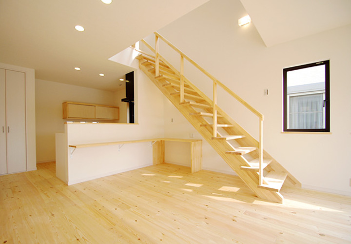 無垢材の床。温もりのある優しい印象のLDK。木製リビング階段-fevecasa フェブカーサ。