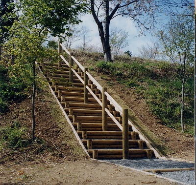 丸太階段 木製階段 - 丸太杭 杭 松杭 丸棒杭 丸棒加工 丸太階段 丸太柵 木柵 フェンス材 デッキ材 土木用木製品 製造販売 有限会社 マルウッド。