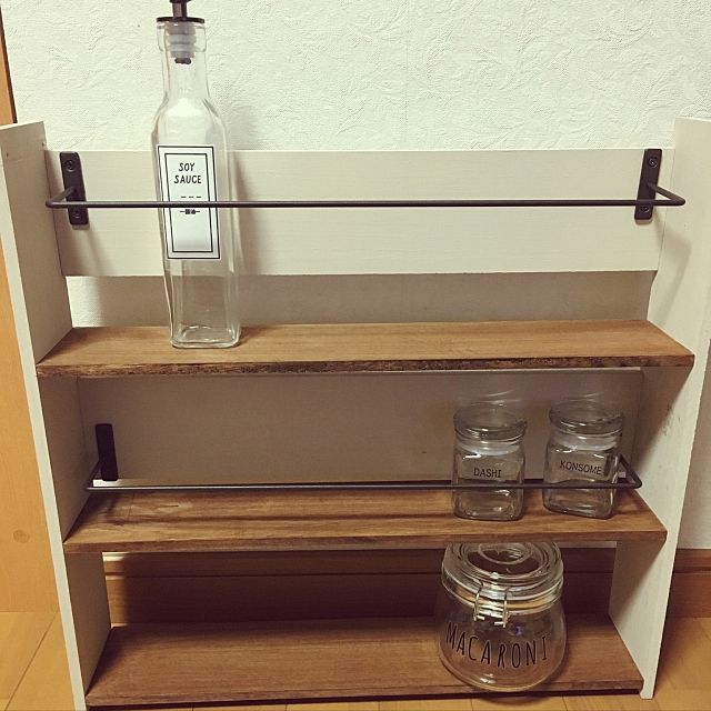 便利な 100均DIY どの場面でも使える調味料棚.ラック キッチンDIY 落下防止付きでたくさん収納できる!!キッチン以外でもOK!!リメイクシートでさらにオシャレになります!! リメイクシート。