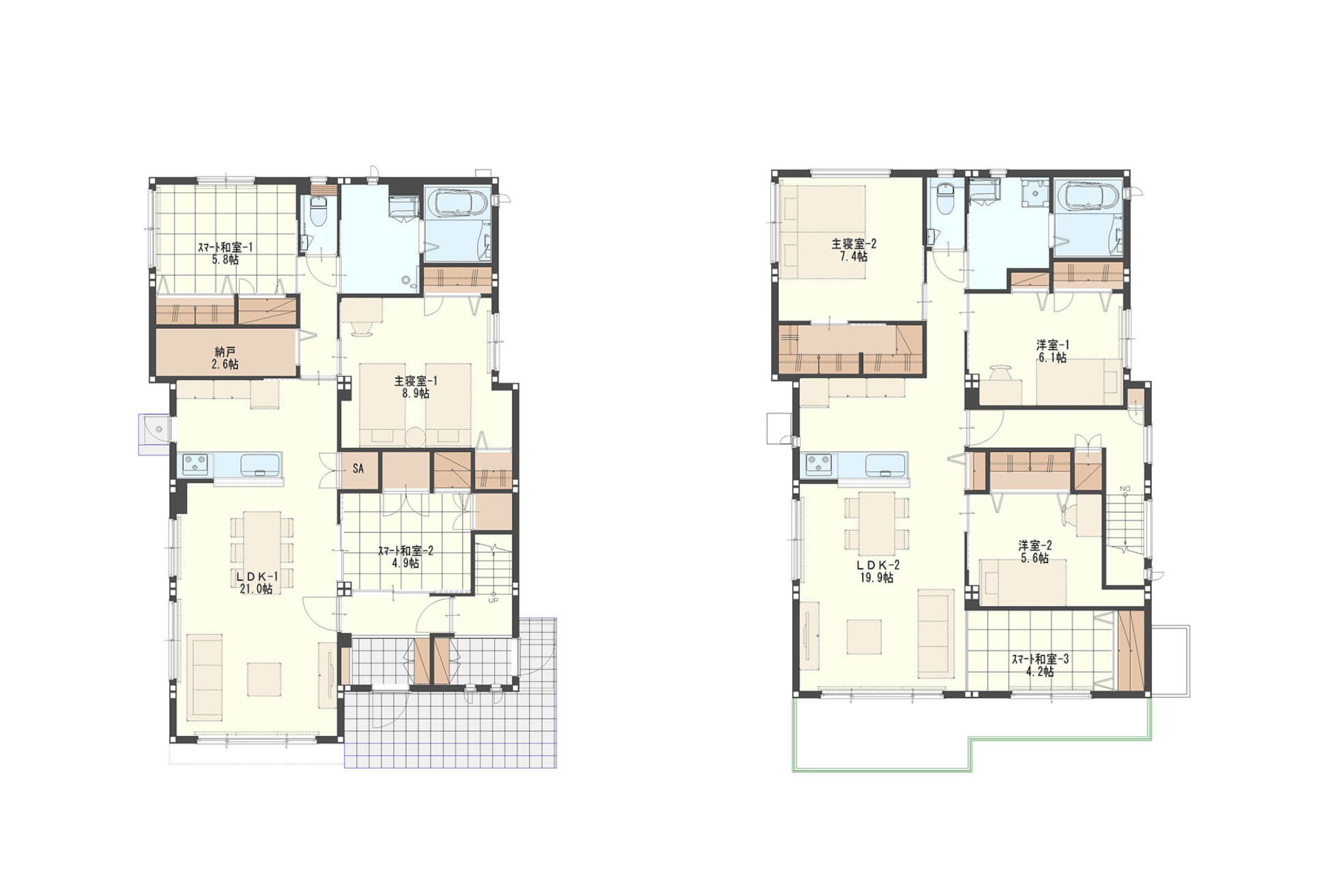 完全分離型二世帯住宅の間取りプラン 2LDK+3LDK注文住宅で自由な間取りは兼六の家練馬区世田谷区杉並区他。