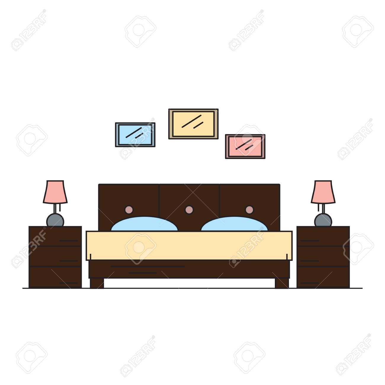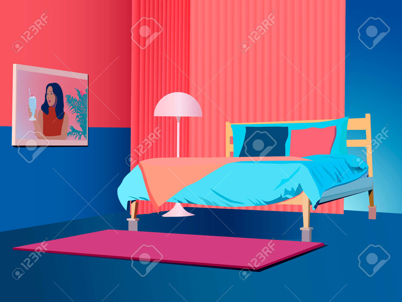 イラストや家の室内装飾のための、ベッド、ランプシェード、ピンクとブルーの色調の壁の絵のある寝室のインテリアのベクトル画像のイラスト素材・ベクターImage 168395388。