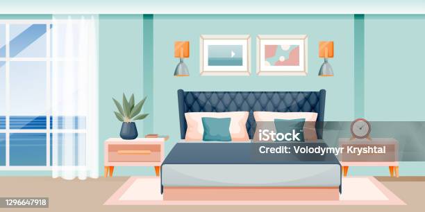 モダンなベッドルームインテリアベクトルフラット漫画のイラスト窓と海の景色を望むホテルの部屋またはアパートメント - くつろぐのベクターアート素材や画像を多数ご用意- iStock。