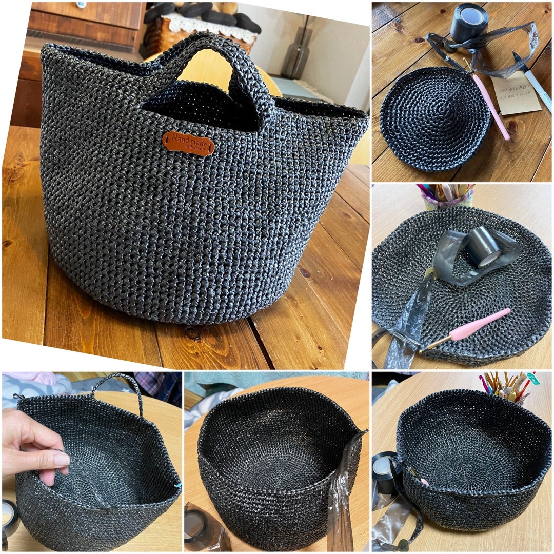 ゆーこさま専用 ビニールテープバッグ スズランテープバッグ かぎ針編み ブラック🔰スズランテープ ビニール紐 超簡単♪模様編みでちょっと大き目 バッグの編み方 かぎ針編み crochet bag。