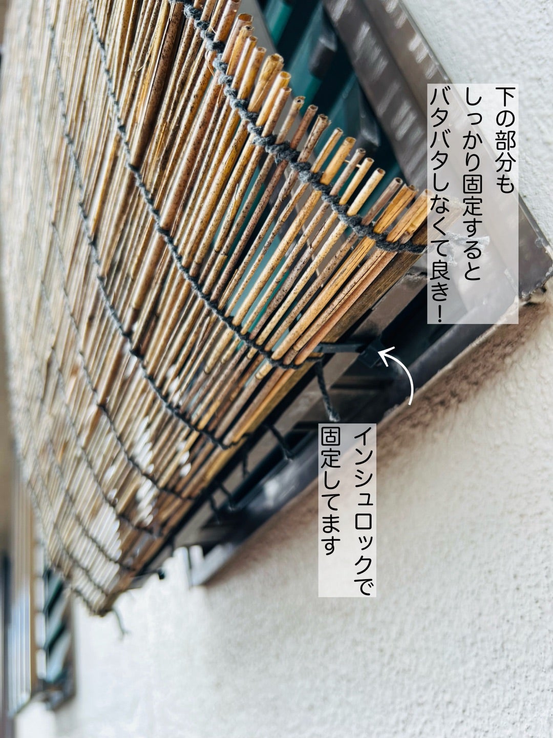 準備物や注意点などまとめてます⬇︎, DIYの費用は2000円ちょいくらいです✨, すだれはホームセンターや百均で300円くらい,雨に打たれると1.2年でカビてくるので、ちょっと注意 , プラスチックのものもいいかなあと思いました🤔, 結束バンドは100均で、,結構微調整したくなるので、, 繰り返し使えるタイプがおすすめです!, 飛んで行かないように、,。