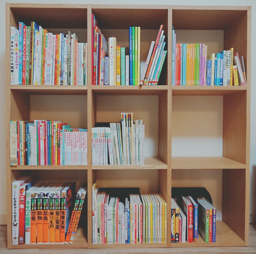 絵本棚に無印良品のスタッキングシェルフ2018.3男の子♡2021.4女の子♡育児ときどき知育日記。