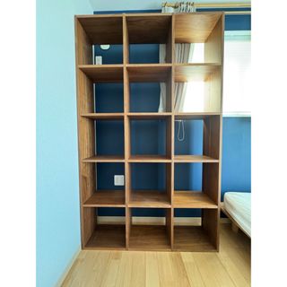 人気の無印良品 MUJI のウォールナット材・3段・4列・スタッキングシェルフ 扉 引出し付きです!オープンタイプの万能棚。スリムなのでリビング などのちょっとしたスペースや本棚に♪ - kokoelma -ココエルマ- 雑貨・中古家具・北欧家具・アンティーク家具の通販。