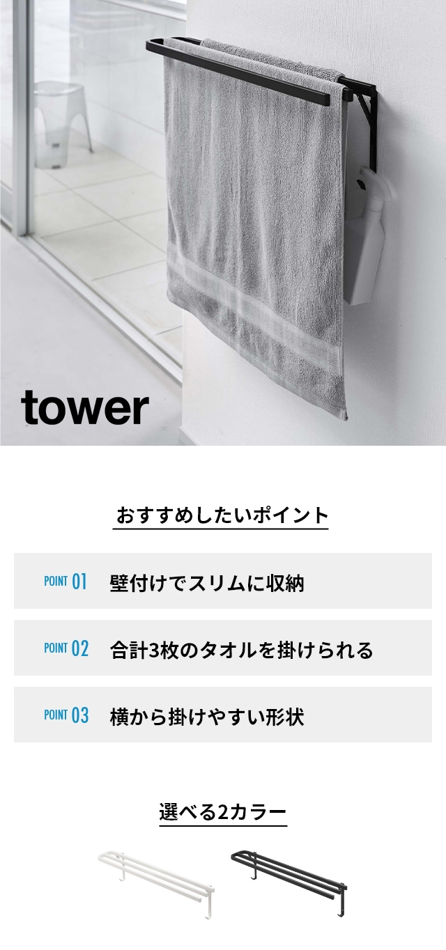 バスタオルハンガー おしゃれ 壁付け 洗面所 ドア 引き出し バスグッズ 北欧 公式 山崎実業 洗面下引っ掛け伸縮バスマット&タオルハンガー タワーtower。