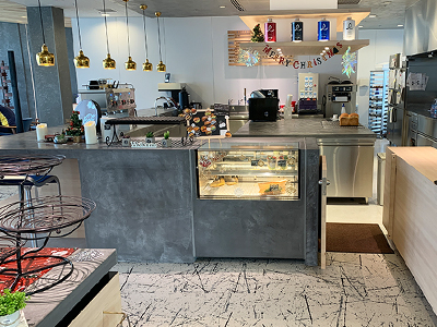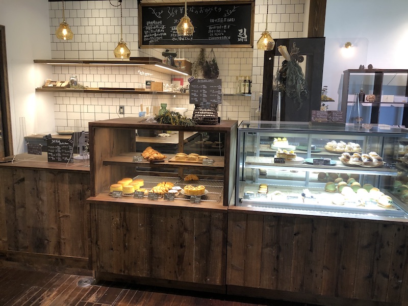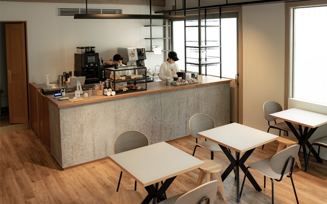 Sweet style カフェ&レストランの店内 レジカウンターには、正面にロゴが。 ショーケースには、多くのスイーツなどが並びます。デザインさせていただきましたカフェ「 Blau espresso 」 高架下にあることで、店内に見えてくる耐震補強されたコンクリート柱を生かした。