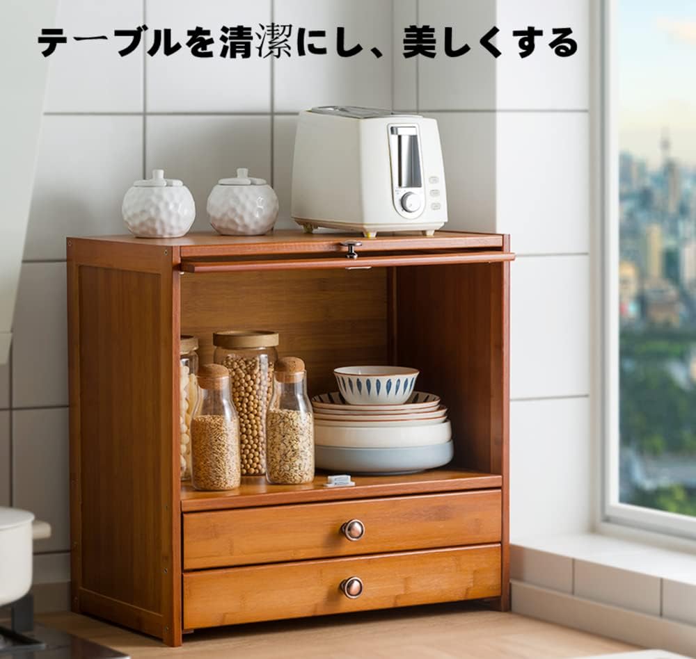 カフェ風カウンターキャビネット 前開き使用 2段 ウッド ガラスケース ブレッドケース ウッドキャビネット ガラスケース キッチン 収納 木製カウンター上収納 ディスプレイケース 飾り棚 カフェ レトロ DIY キッチン カウンター ショーケース 食パン スパイスラック。