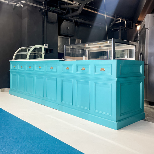 カフェレストラン向け冷蔵ショーケース内蔵レジカウンターW2500スパニッシュグリーン色。