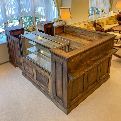 カウンターガラスケース イギリスアンティーク オーク材 気品あふれるディスプレイが叶うカウンターガラスケース ショ。