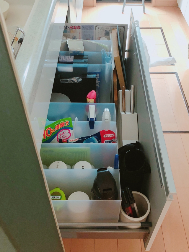 シンク下の引き出し整理にニトリ大活躍」 ずっと放置してたキッチンのシンク下の 一番下の引き出し整理にようやく着手。 実はこの一番下の引き出し、引っ越してから1年近くその存在に気付かず、 キッチンの床を掃除している時に 「ん?なんか取手が付いてるな 」と思って。