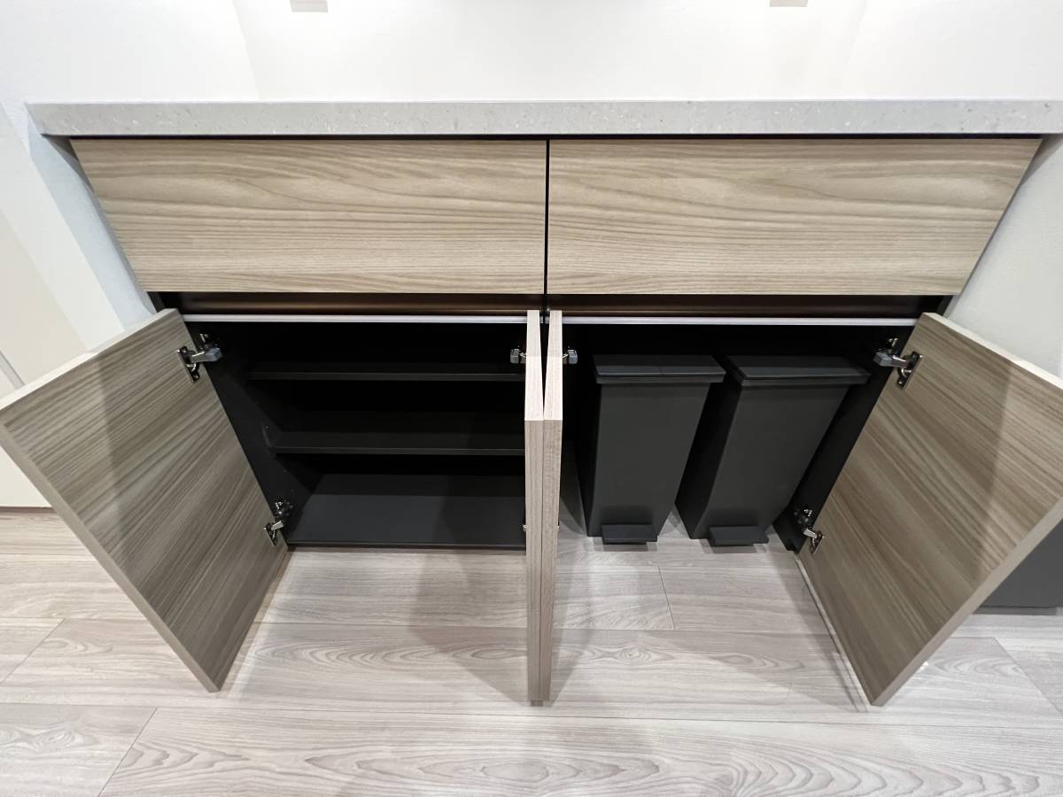 背面収納にゴミ箱も収納してスッキリ♪:システムキッチン・流し台・バス・トイレがお得。