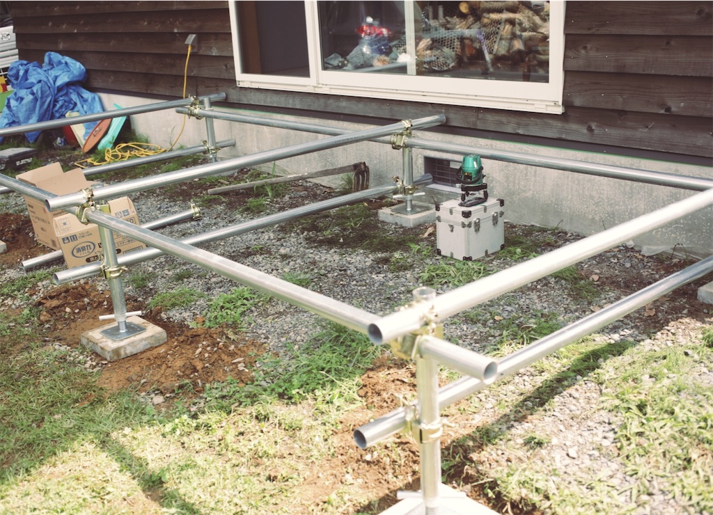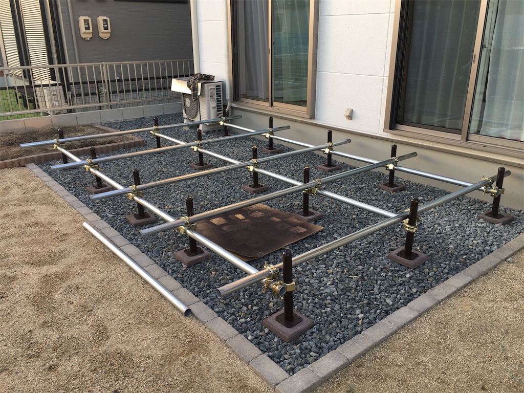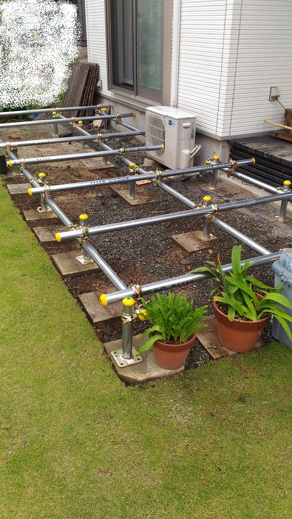 ウッドデッキ作成 作業1日目 単管パイプで床下構造部分: 庭造り 記録日記。