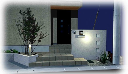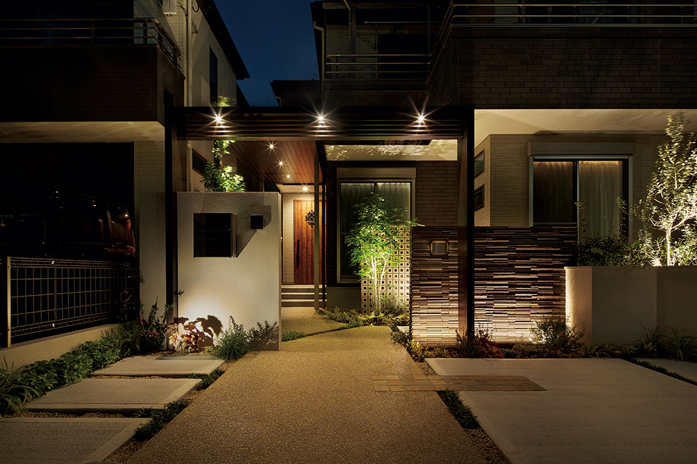 玄関アプローチをデザイン性の高い住まいの「顔」にする外構アイテムタカショー空間実例紹介。