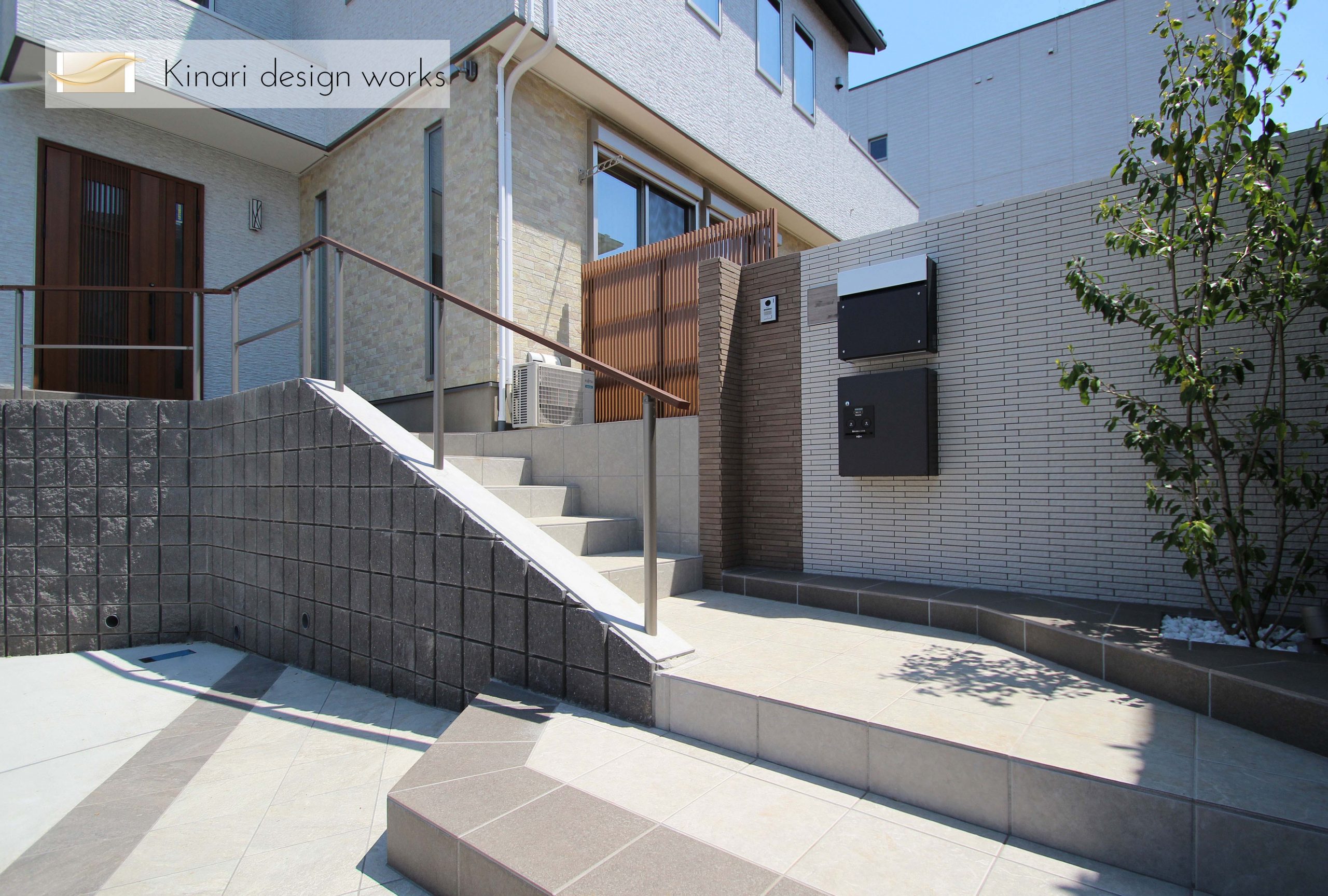 千葉市。端正に割り付けたエントランス。高低差のあるアプローチの洗練されたグレージュワントーン。一級建築 士と叶える素敵なお庭千葉市エクステリア・外構・ガーデンキナリデザイン。