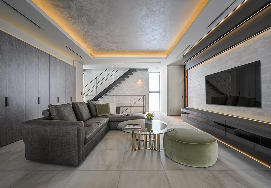 the ホテルライクリビング施主様の想いの詰まった、 ラグジュアリーモダンなリビング。 グレーをテーマカラーに、各マテリアルの配置と配色をコーディネートして、 海外ホテルのような、特別な空間を演出。 Full of the owner's feelings,Filled with the feelings。