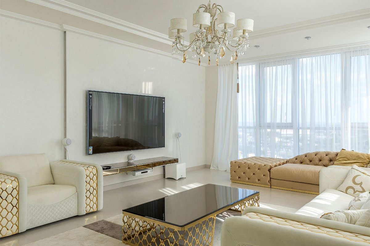 白が決め手のラグジュアリーモダン!高級感が心地良い10畳リビングカヴァースインテリア。