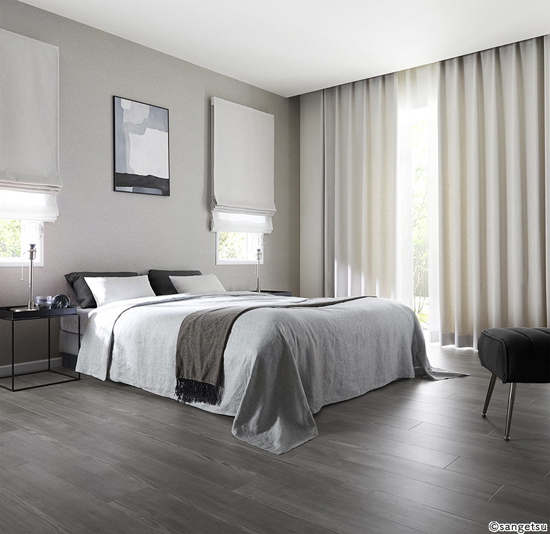 モルタル風クロスで落ち着いた寝室 – クロスの貼り替えリフォームやコーディネートのご相談は茅ヶ崎のACS。