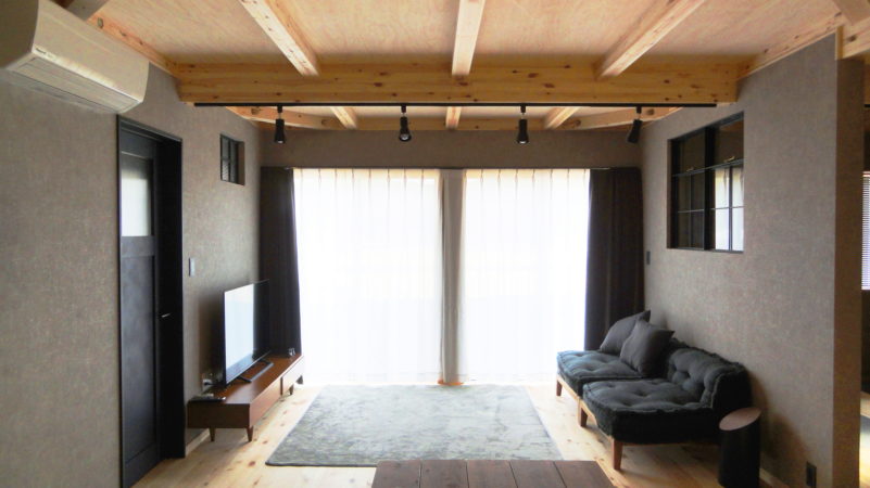 ブルックリンスタイルハウス『寝室』 寝室にはサンゲツのコンクリート風のアクセントクロスを採用。リビングと寝室をつなぐドアは、輸入ドアに工房長が塗装とビンテージ加工を施した唯一無二のドアです。 気になる点がありましたら、お気軽にお問合せください。※施工。