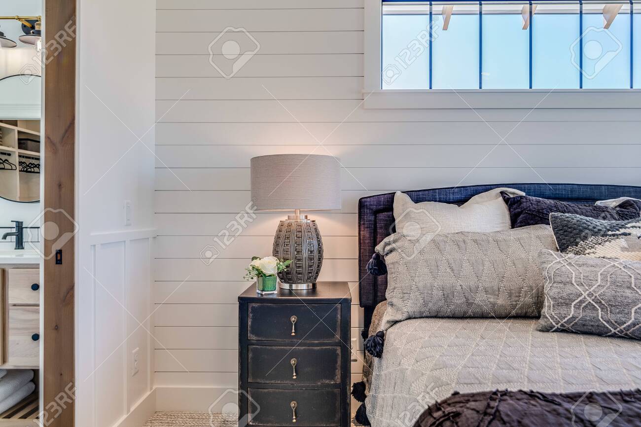 シップラップの壁とアーチ型天井を備えた素晴らしいマスターベッドルームの写真素材・画像素材 Image 147552383。