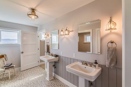 美しい床の浴室のシップラップの壁の写真素材・画像素材 Image 144666989。