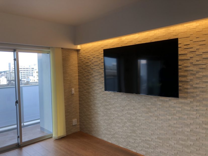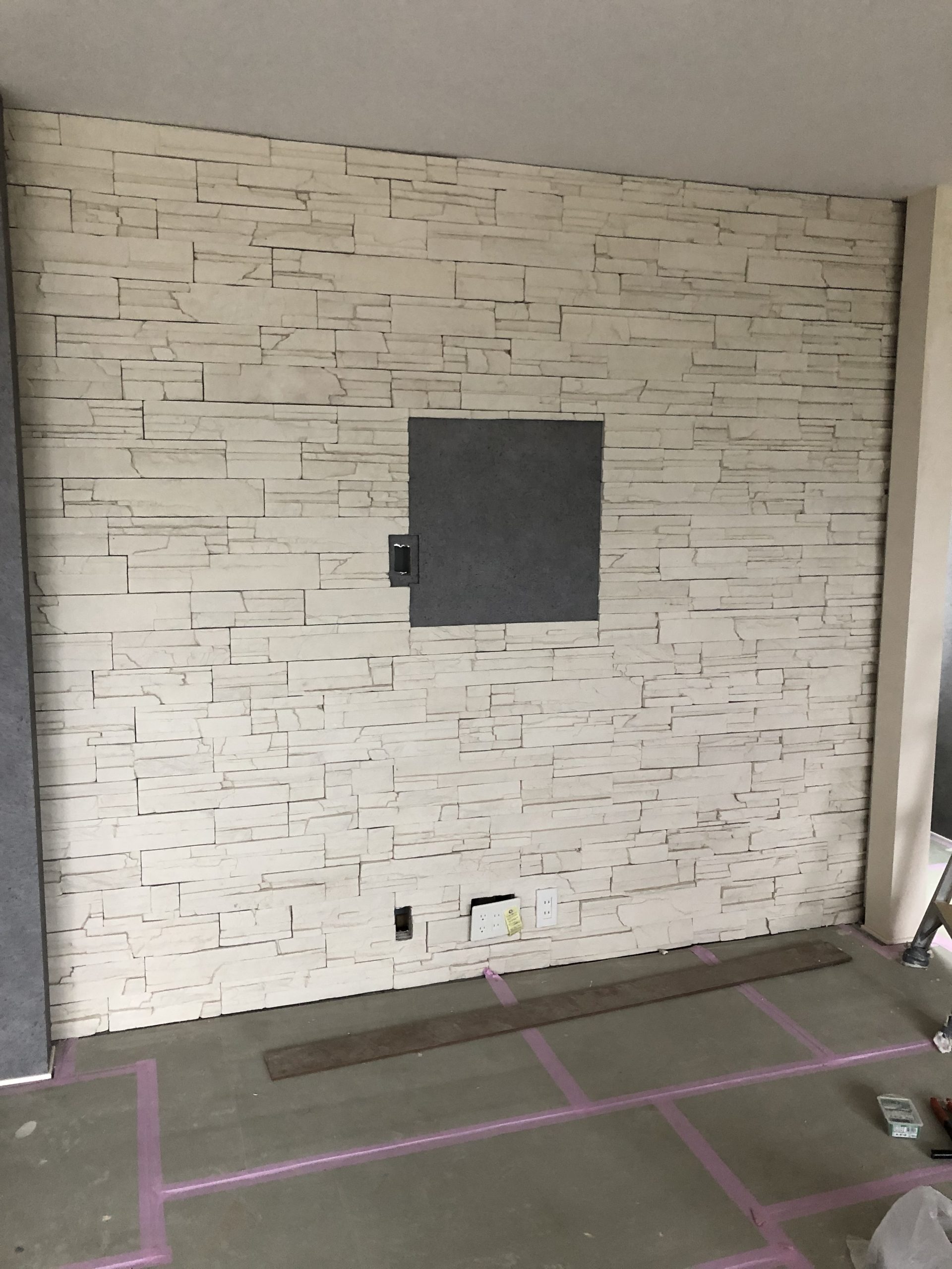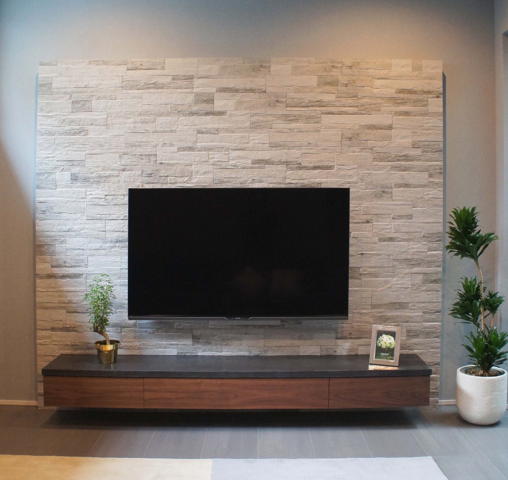 テレビの後ろの壁は平田タイルのRe-Work リワーク で石壁風にしました。ダイワハウスXEVOΣで家を建てた記録 in 2018。
