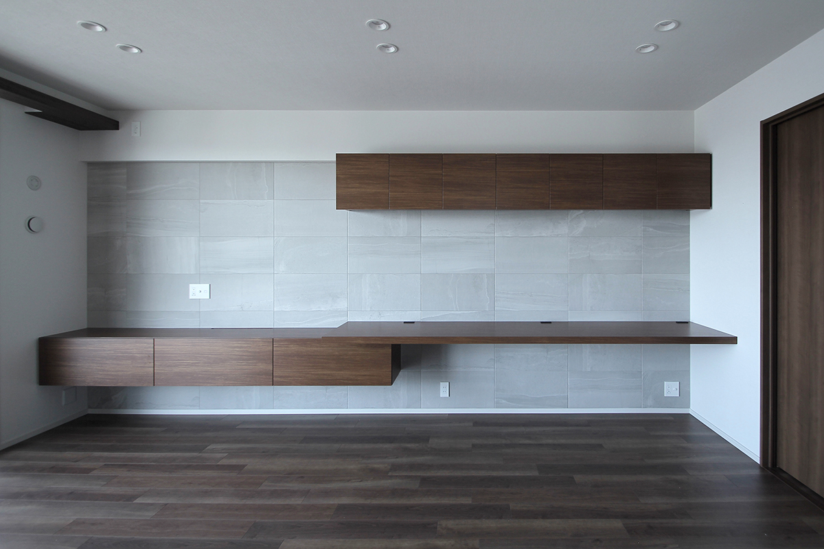 壁も床と同じタイルを用い統一感を強調した くふうイエタテ。