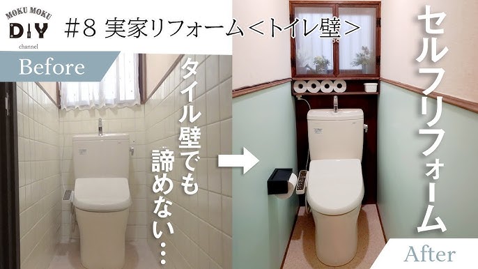08 実家リフォーム-トイレ壁 古臭いタイル壁が激変!両面テープで簡単リフォーム。