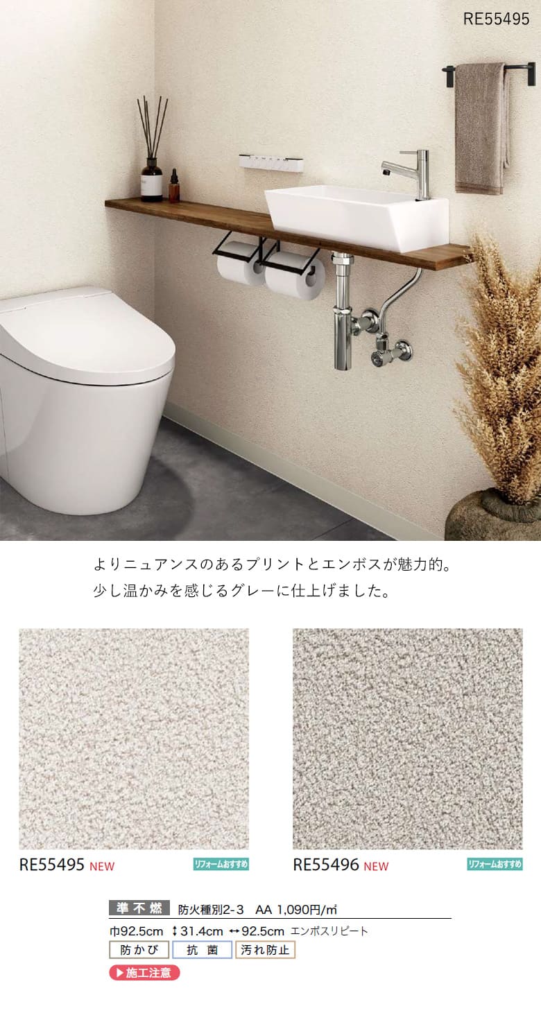 壁紙 のり付き のりつき クロス 国産壁紙 トイレ 洗面所 防汚 抗菌 フィルム汚れ防止壁紙 サンゲツ RE-55491〜RE-55507。
